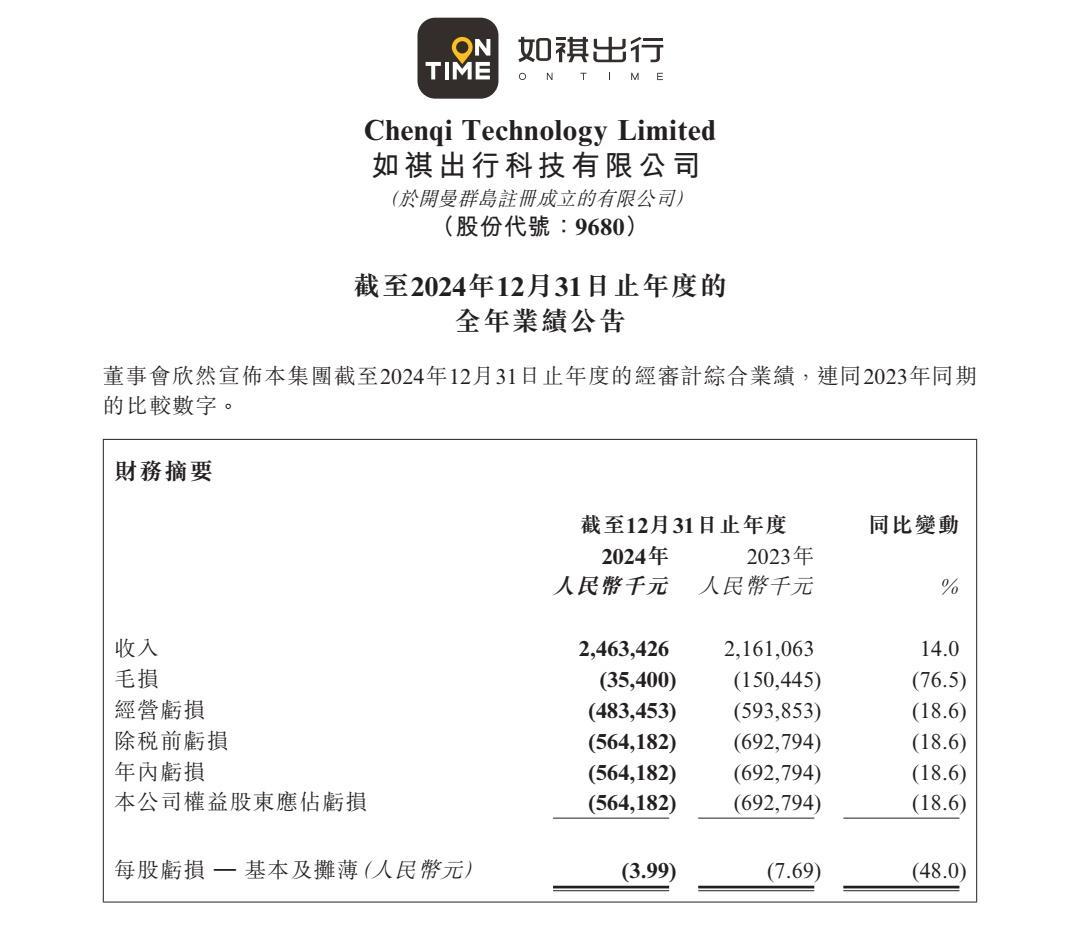 3月27日,如祺出行(09680.HK)发布2024年度业绩公告。2024年,如祺出行全年总收入达到24.63亿元人民币,较2023年同期的21.61亿元增加14.0%。毛损显著改善,从2023年的1.5亿元减少至3540万元,降幅达到76.5%。经营亏损也有所减少,从5.94亿元减至4.83亿元,降幅为18.6%。此外,年内收益和归母净利润均为亏损5.64亿元,同比减少18.6%。